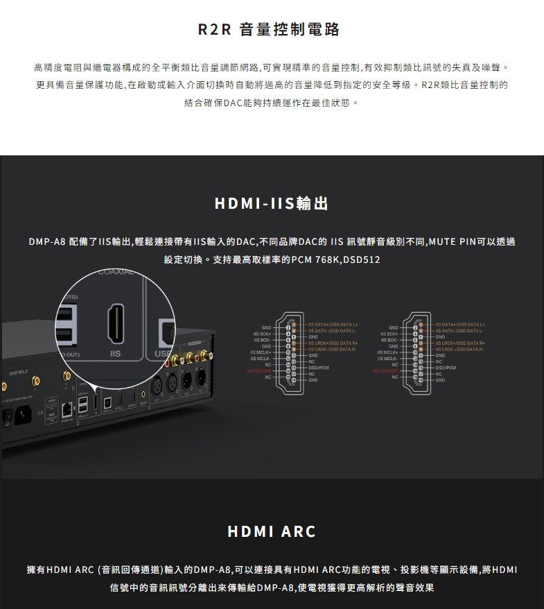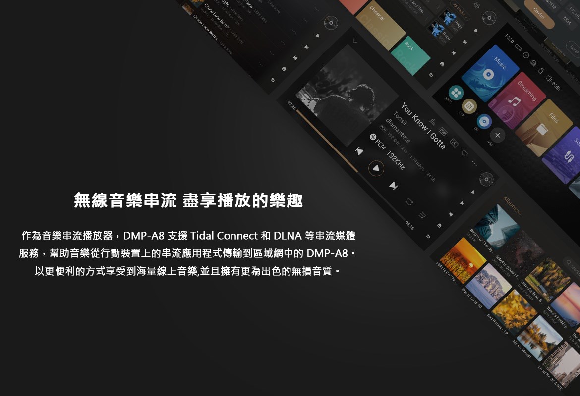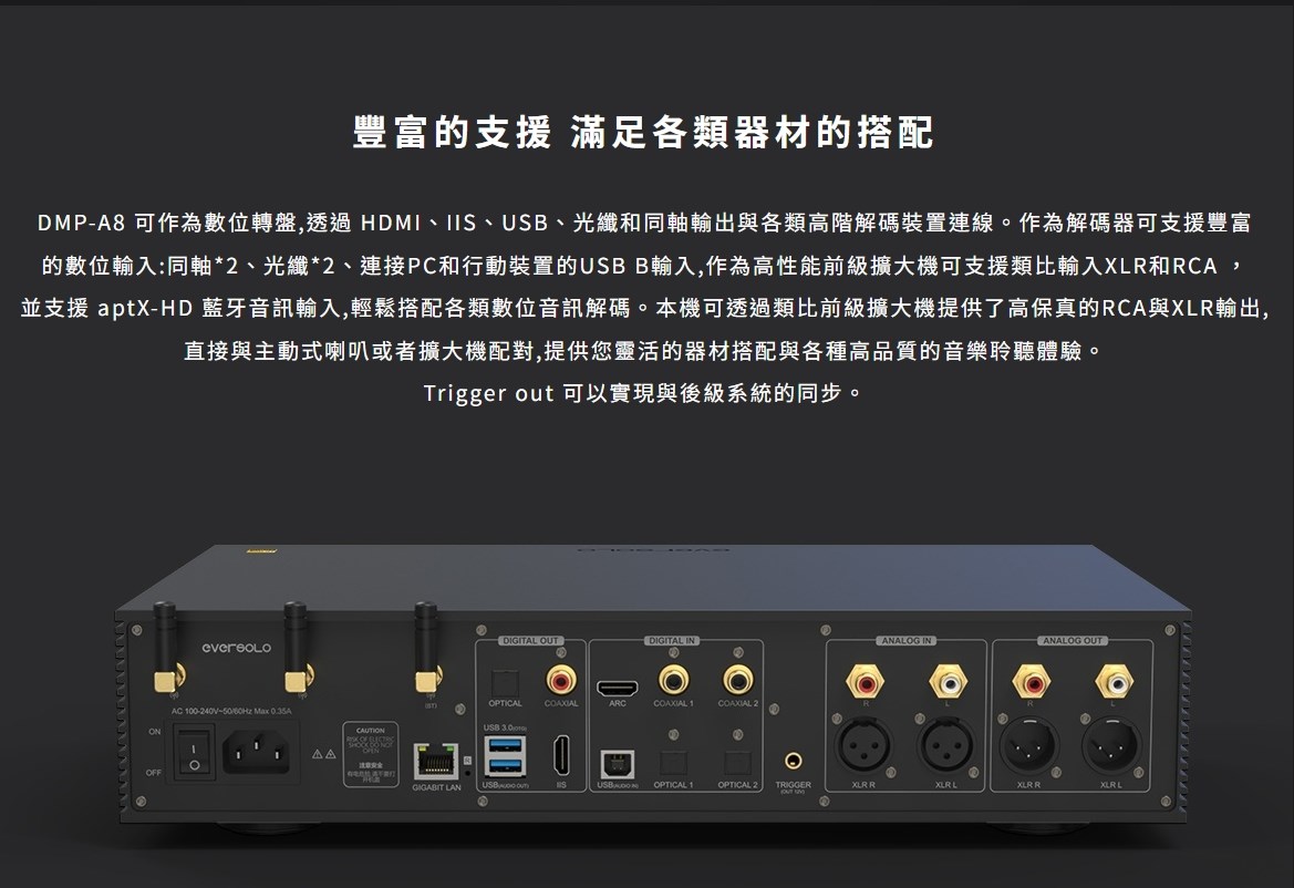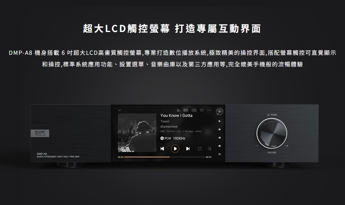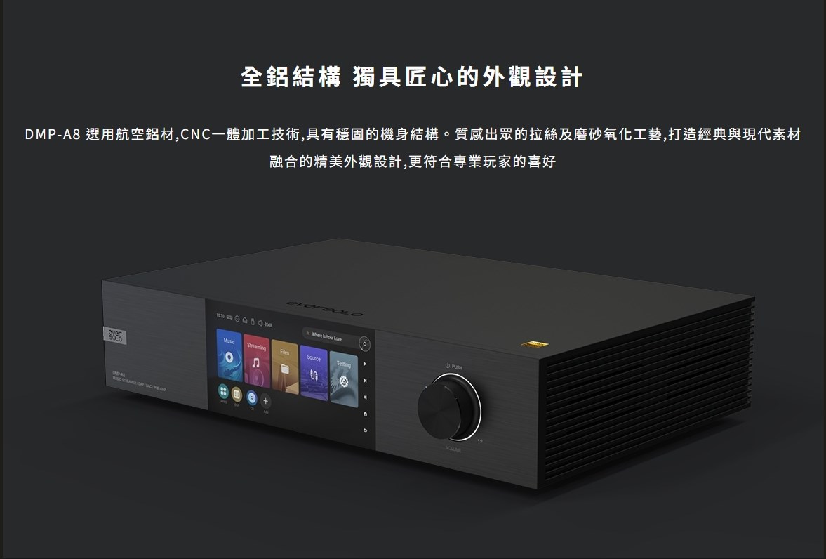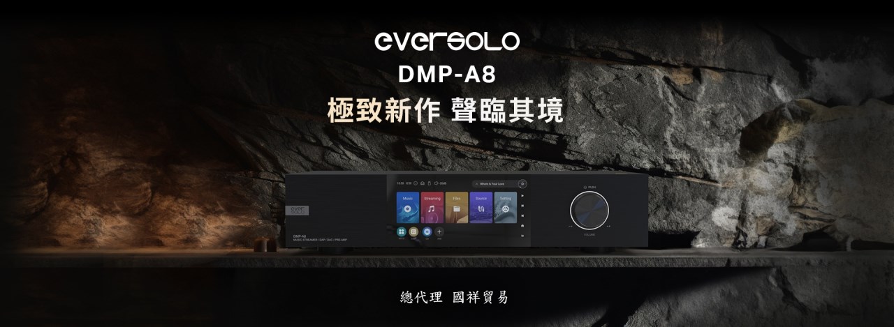 eversolo DMP-A8 具備網路串流播放機、數位類比轉換器(DAC)與數位前級功能於一身的全新音樂播放器,繼承了 DMP-A6 的優秀設計和絕佳性能,同時在硬體和軟體方面進行了全面升級和優化。支援 DSD512 (dsf/.dff/iso/.dst)立體聲,APE、FLAC、WAV、MQA 等音檔格式。eversolo DMP-A8 不僅具有極致的音質,還具有強大的功能和靈活的擴展性,可以滿足不同用戶的需求。是一款值得您入手的高規串流播放機,也是一款可以陪伴您長久的音樂夥伴。 註:DSP模組最高支持PCM 192Khz,高於此採樣率的PCM與DSD格式將Bypass輸出DSP僅針對本地播放/ 網路串流及光纖輸入/同軸輸入/USB輸入/藍牙輸入/ARC輸入,並且類比輸出時生效 豐富的串流音樂服務 眾多音樂觸手可及 DMP-A8音樂服務可直接下載全球多個主流音樂內容服務平台:TIDAL、Qobuz、KKBOX、Spotify音樂等, 可以透過網路直接享受巨量高品質音樂服務。 下載的音樂服務可同時通過本機螢幕與手機控制APP瀏覽與播放, 讓您感受無限串流音樂的魅力 無線音樂串流 盡享播放的樂趣 作為音樂串流播放器,DMP-A8 支援 Tidal Connect 和 DLNA 等串流媒體服務,幫助音樂從行動裝置上的 串流應用程式傳輸到區域網中的 DMP-A8。以更便利的方式享受到海量線上音樂,並且擁有更為出色的無損音質。