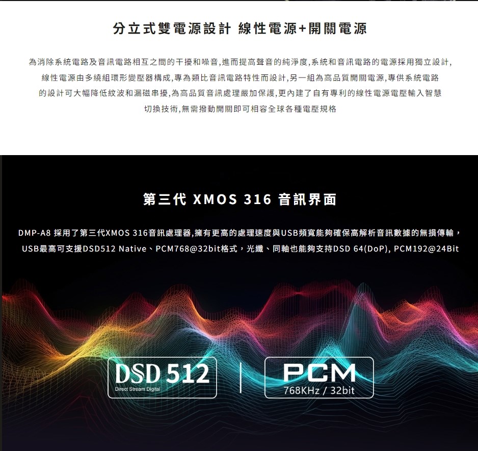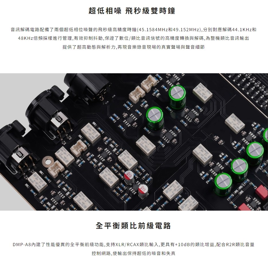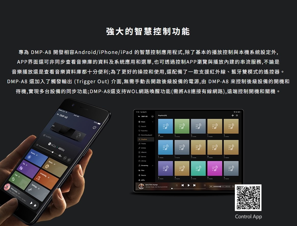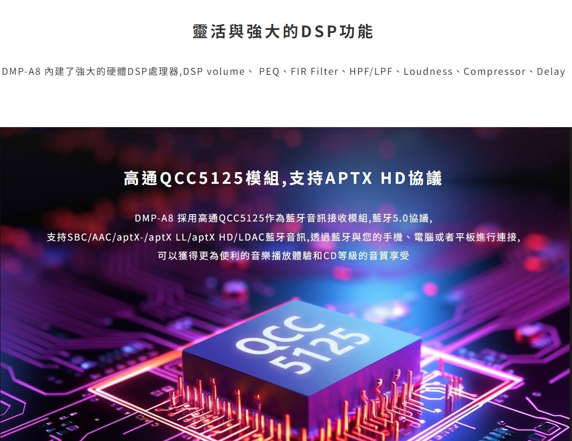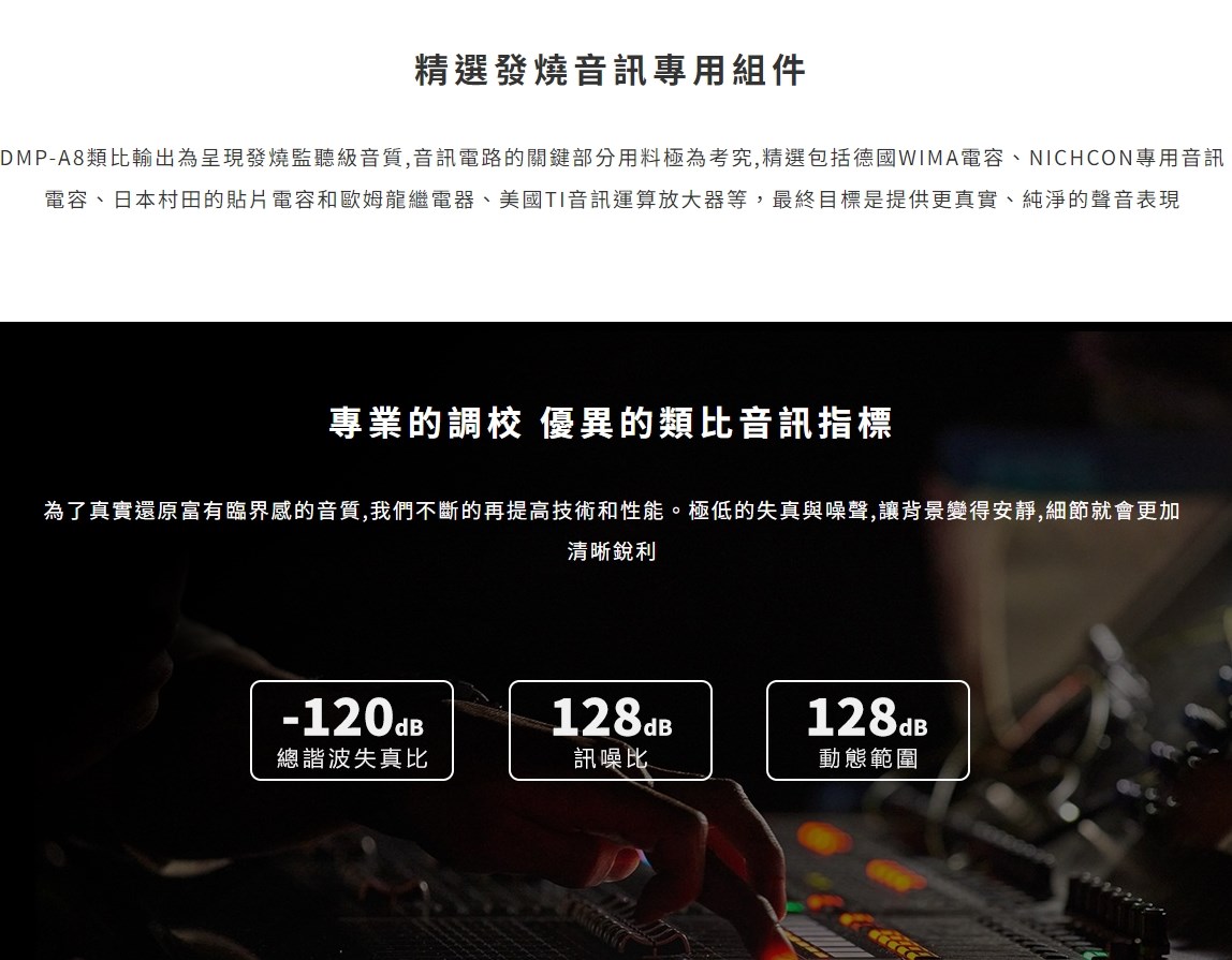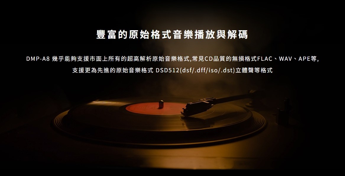 eversolo DMP-A8 具備網路串流播放機、數位類比轉換器(DAC)與數位前級功能於一身的全新音樂播放器,繼承了 DMP-A6 的優秀設計和絕佳性能,同時在硬體和軟體方面進行了全面升級和優化。支援 DSD512 (dsf/.dff/iso/.dst)立體聲,APE、FLAC、WAV、MQA 等音檔格式。eversolo DMP-A8 不僅具有極致的音質,還具有強大的功能和靈活的擴展性,可以滿足不同用戶的需求。是一款值得您入手的高規串流播放機,也是一款可以陪伴您長久的音樂夥伴。 註:DSP模組最高支持PCM 192Khz,高於此採樣率的PCM與DSD格式將Bypass輸出DSP僅針對本地播放/ 網路串流及光纖輸入/同軸輸入/USB輸入/藍牙輸入/ARC輸入,並且類比輸出時生效 豐富的串流音樂服務 眾多音樂觸手可及 DMP-A8音樂服務可直接下載全球多個主流音樂內容服務平台:TIDAL、Qobuz、KKBOX、Spotify音樂等, 可以透過網路直接享受巨量高品質音樂服務。 下載的音樂服務可同時通過本機螢幕與手機控制APP瀏覽與播放, 讓您感受無限串流音樂的魅力 無線音樂串流 盡享播放的樂趣 作為音樂串流播放器,DMP-A8 支援 Tidal Connect 和 DLNA 等串流媒體服務,幫助音樂從行動裝置上的 串流應用程式傳輸到區域網中的 DMP-A8。以更便利的方式享受到海量線上音樂,並且擁有更為出色的無損音質。