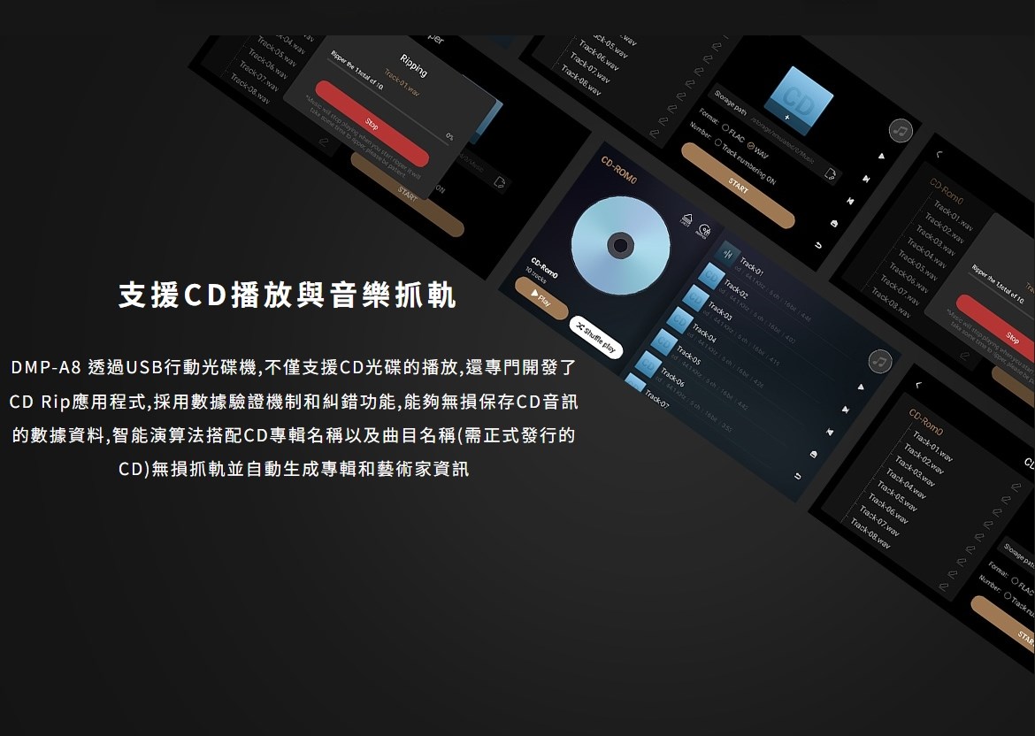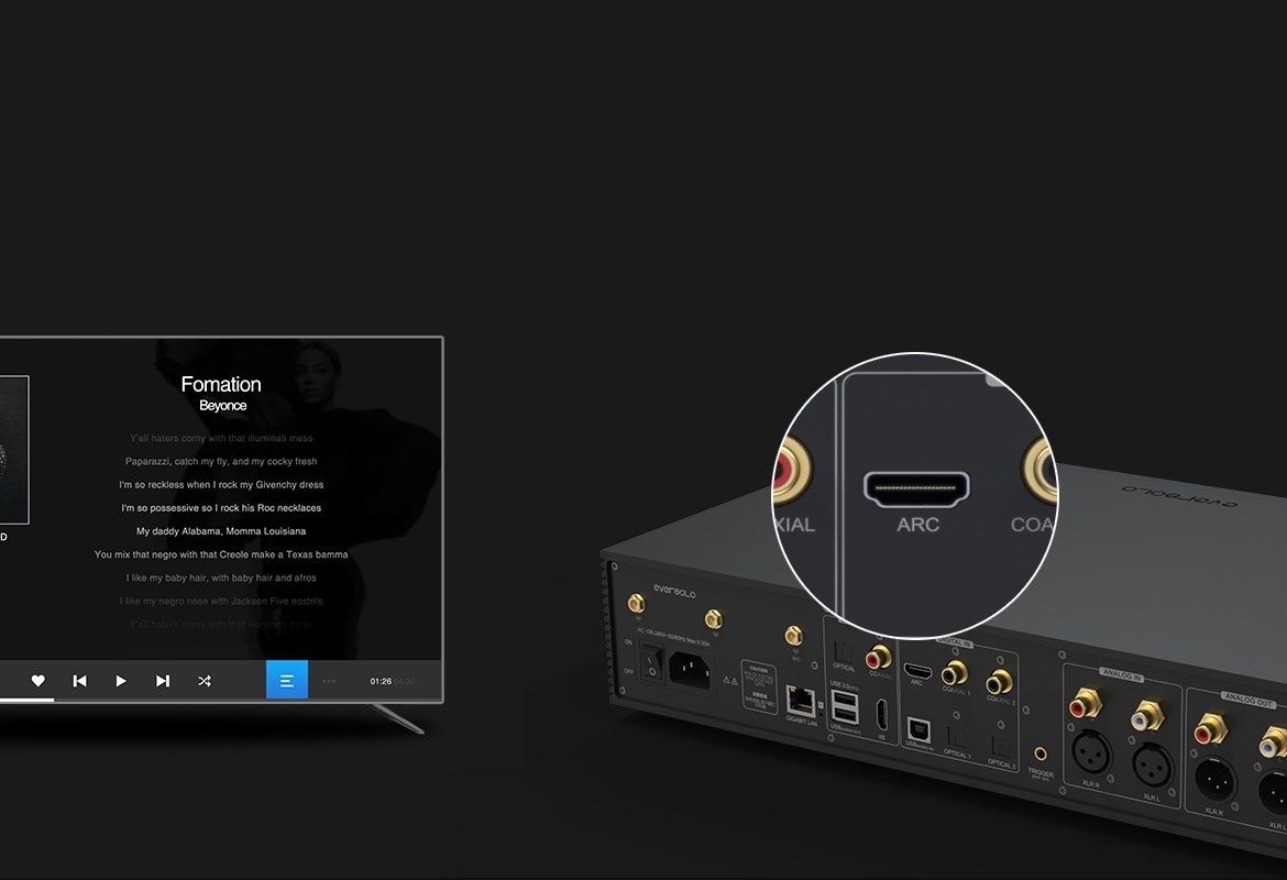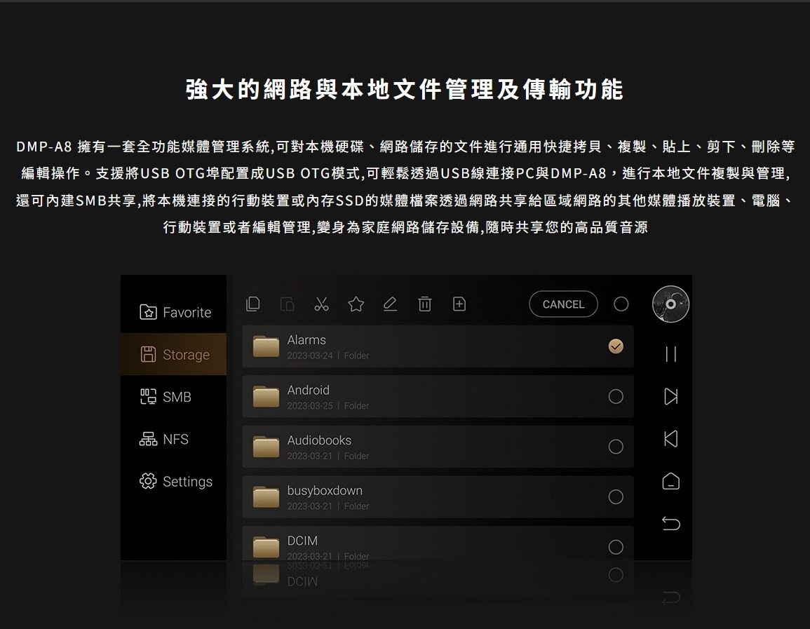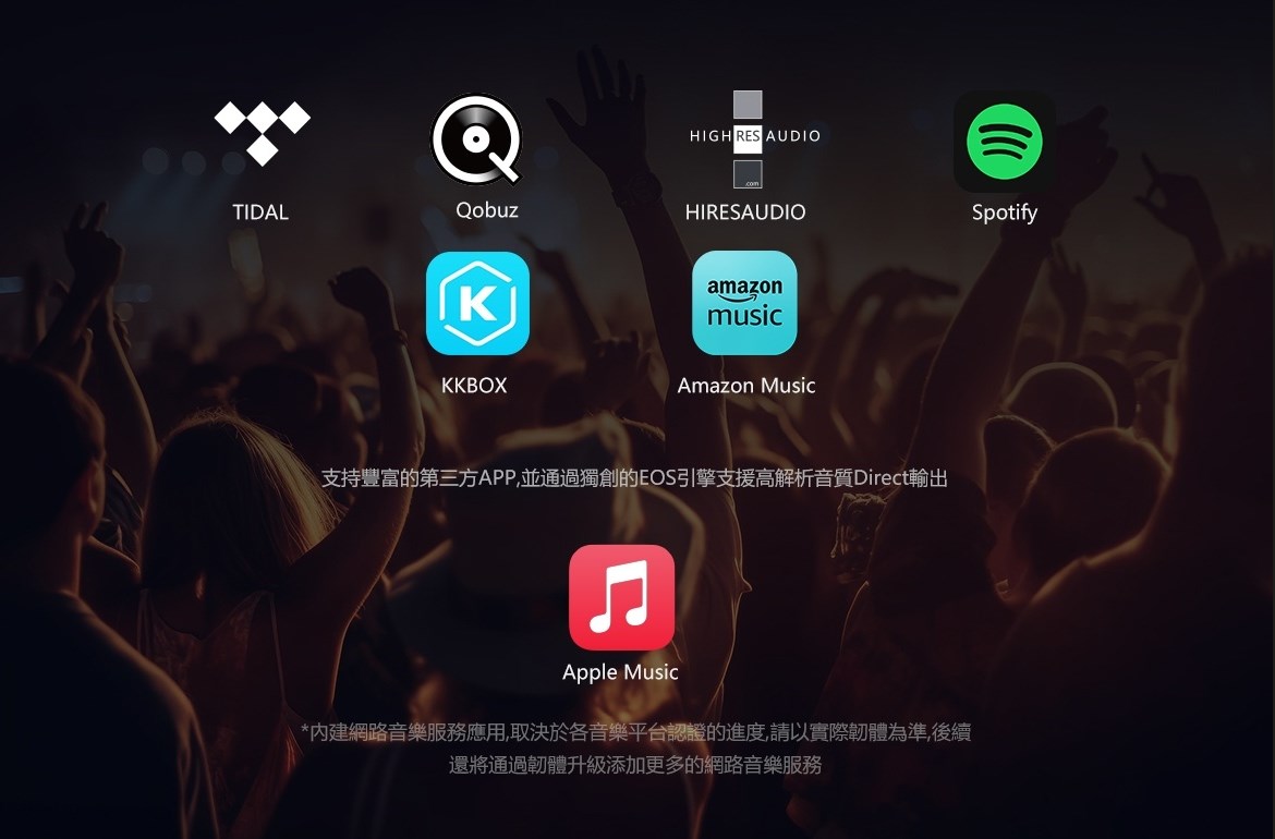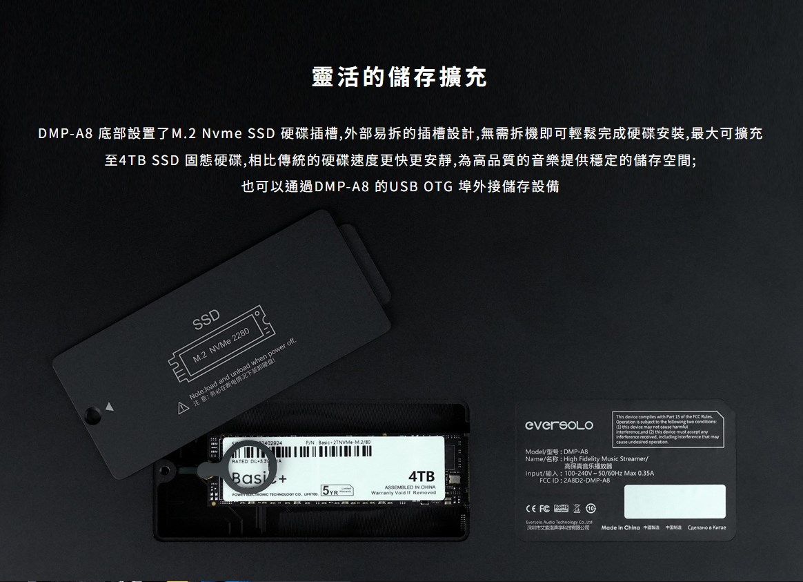 eversolo DMP-A8 具備網路串流播放機、數位類比轉換器(DAC)與數位前級功能於一身的全新音樂播放器,繼承了 DMP-A6 的優秀設計和絕佳性能,同時在硬體和軟體方面進行了全面升級和優化。支援 DSD512 (dsf/.dff/iso/.dst)立體聲,APE、FLAC、WAV、MQA 等音檔格式。eversolo DMP-A8 不僅具有極致的音質,還具有強大的功能和靈活的擴展性,可以滿足不同用戶的需求。是一款值得您入手的高規串流播放機,也是一款可以陪伴您長久的音樂夥伴。 註:DSP模組最高支持PCM 192Khz,高於此採樣率的PCM與DSD格式將Bypass輸出DSP僅針對本地播放/ 網路串流及光纖輸入/同軸輸入/USB輸入/藍牙輸入/ARC輸入,並且類比輸出時生效 豐富的串流音樂服務 眾多音樂觸手可及 DMP-A8音樂服務可直接下載全球多個主流音樂內容服務平台:TIDAL、Qobuz、KKBOX、Spotify音樂等, 可以透過網路直接享受巨量高品質音樂服務。 下載的音樂服務可同時通過本機螢幕與手機控制APP瀏覽與播放, 讓您感受無限串流音樂的魅力 無線音樂串流 盡享播放的樂趣 作為音樂串流播放器,DMP-A8 支援 Tidal Connect 和 DLNA 等串流媒體服務,幫助音樂從行動裝置上的 串流應用程式傳輸到區域網中的 DMP-A8。以更便利的方式享受到海量線上音樂,並且擁有更為出色的無損音質。