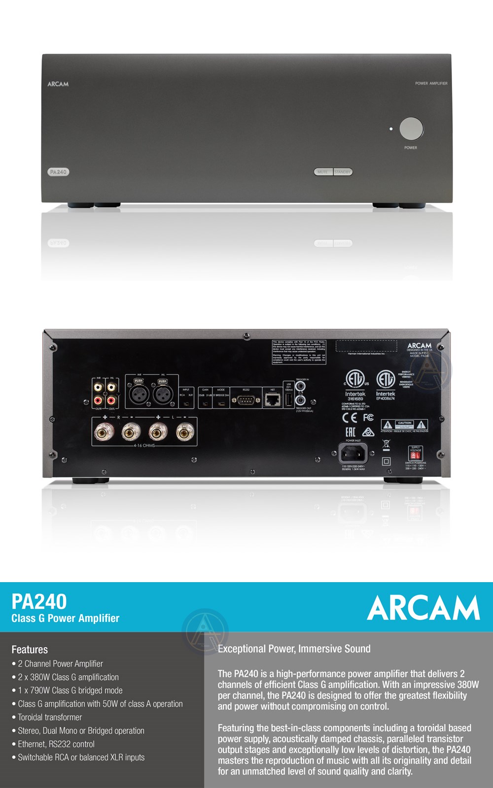 英國設計的ARCAM PA240 後級擴大機採用該公司引以為傲的G類放大技術,它可說是AB類放大的進化版,同時有低失真的特性且供電效率更高,減少不必要的耗電以及廢熱。提供ST、Bridge、DM三種模式選擇,Bridge模式可讓您橋接兩台擴大機作為單聲道後級使用以增加推力,DM模式則可做Bi-Amp連接。