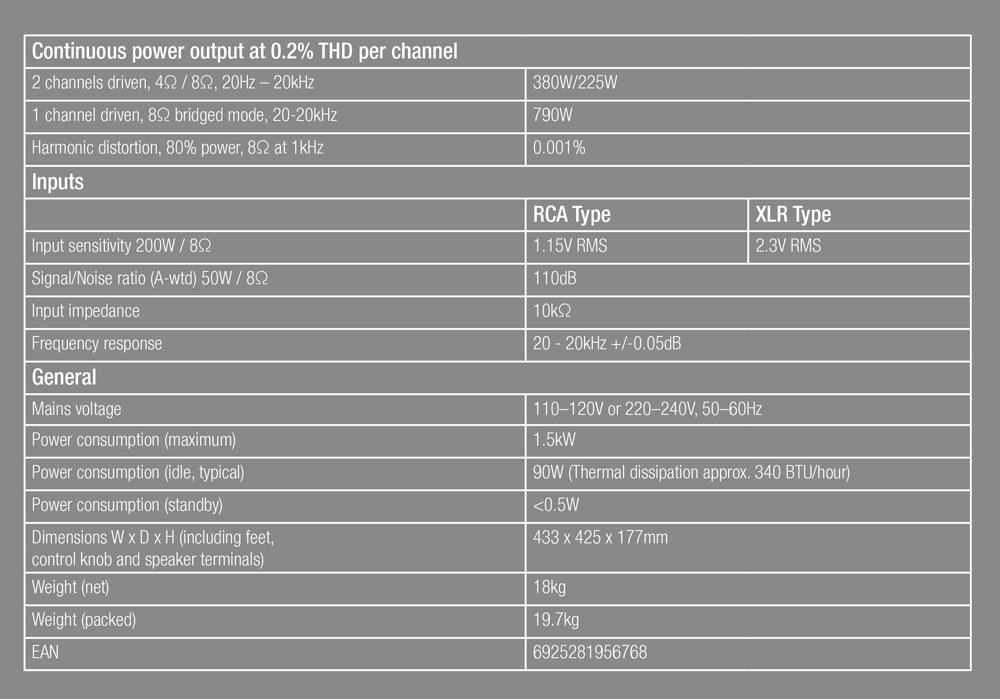 THD:0.001%(8歐姆80%輸出)、0.2%(8歐姆225瓦、4歐姆380瓦,20-20kHz)