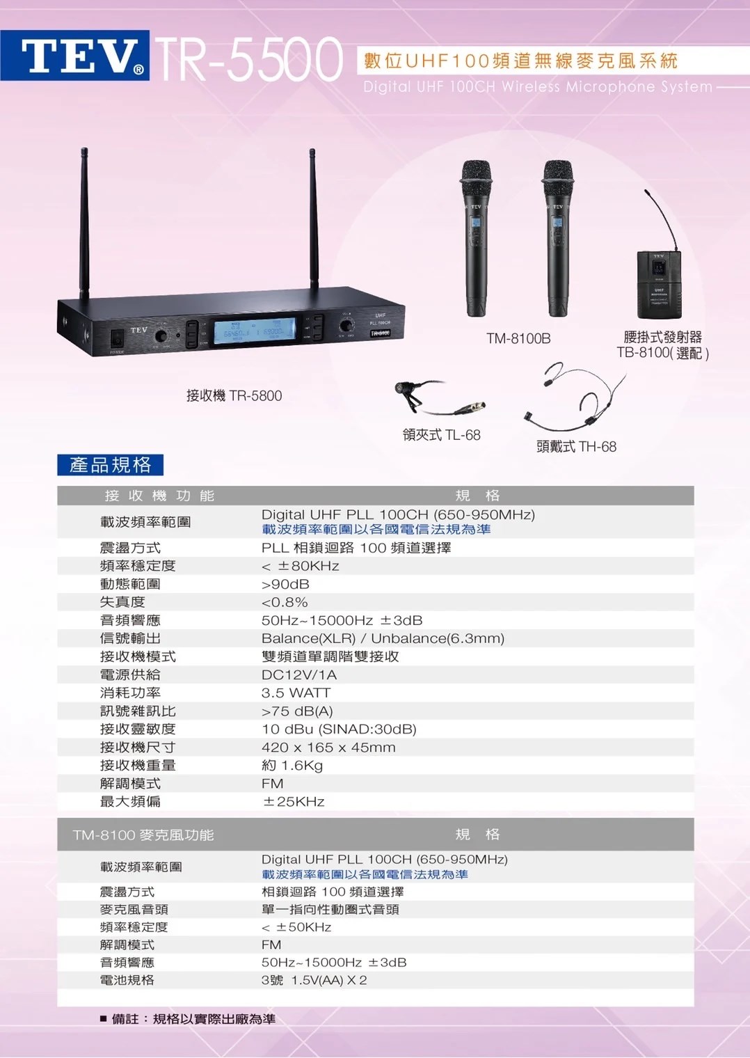 台灣電音 TEV TR-5500 數位UHF100頻道無線麥克風系統
