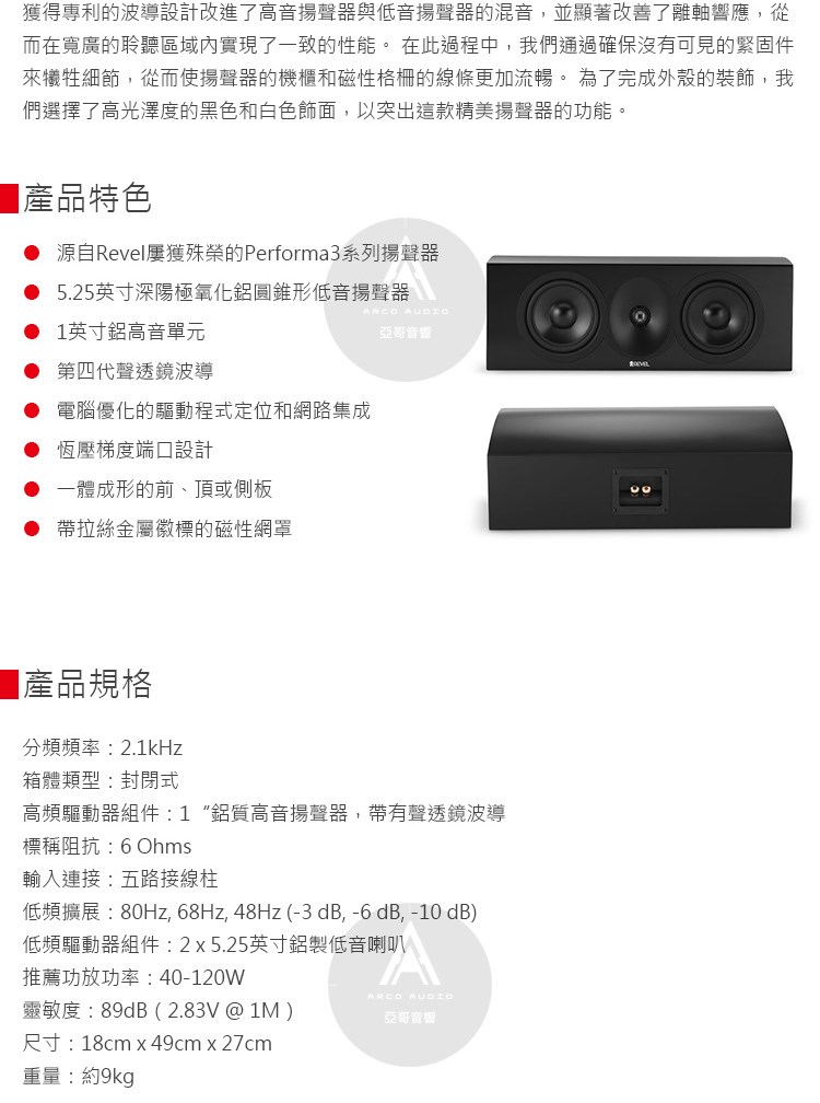 標準阻抗:6 Ohms 輸入連接:五路接線柱 建議放大功率:40-120W 靈敏度:89 dB(2.83V @ 1M) 尺寸(H×W×D):18.4cm x 49.4cm x 27cm 公分 重量:9 公斤