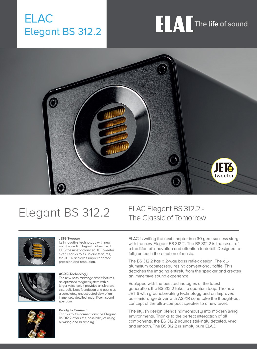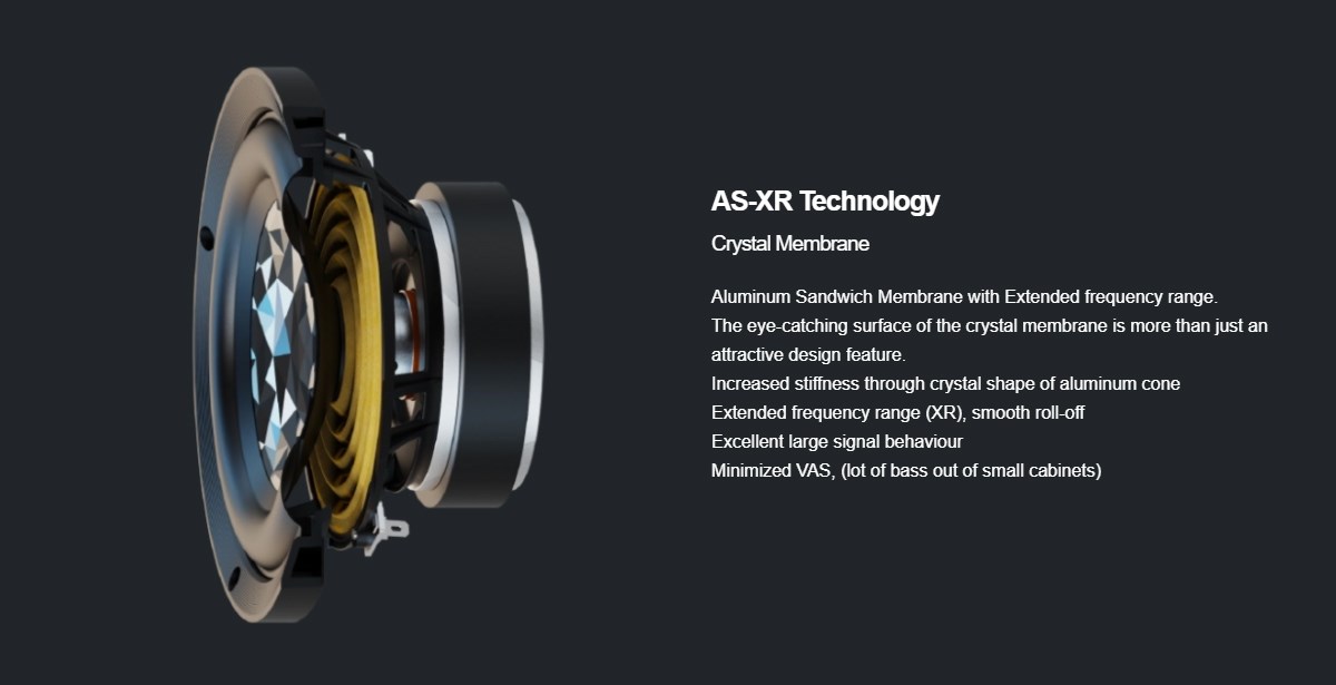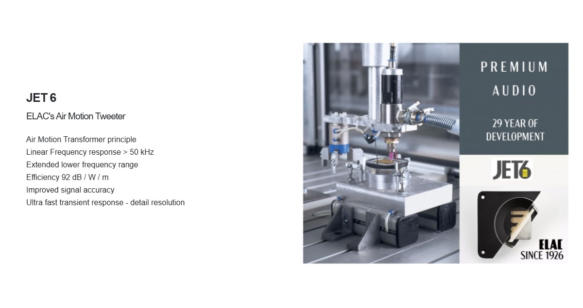 商品規格 型式:2 單體 2 音路低音反射式書架喇叭 使用單體:JET 6 高音 × 1,115 mm AS-XR 中音單體 × 1 頻率響應:42 Hz – 50 kHz 建議擴大機功率:50~150 瓦 / 每聲道 分頻點:3.2 kHz 效率(靈敏度):87 dB (2.83 v/1m) 平均阻抗:4Ω (最小3.4Ω@280 Hz ) 尺寸:208 × 123 × 282 mm (高×寬×深) 重量:7.2 kg